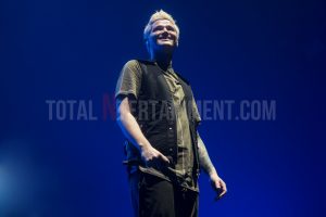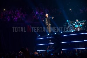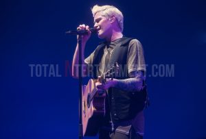 As stage time nears there is an excitement fizzing around the venue before a curtain drops to reveal the three band members stood on a B-stage situated in the middle of the arena floor. Pandemonium ensues as the arena floor becomes a sea of outstretched arms and illuminated smartphones. The band, now elevated fifteen feet in the air, open up with Superheroes and Rock The World before, bathed in green light, they continue with a confetti-drenched “Paint The Town Green”.