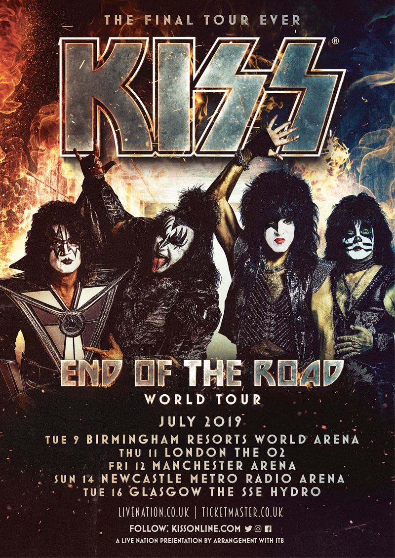 After an epic and well documented 45-year career that launched an era of rock n roll legends, KISS announced that they will launch their final tour ever in 2019, appropriately named END OF THE ROAD. The initial announcement was made a month ago on NBC’s America’s Got Talent which sent the internet into overdrive with fans hoping their city and country would get one final KISS show. The band announced today the first set of dates and cities in North America, as well as international markets being announced simultaneously. Tickets go on sale on 02 November at 10am at LiveNation.co.uk.